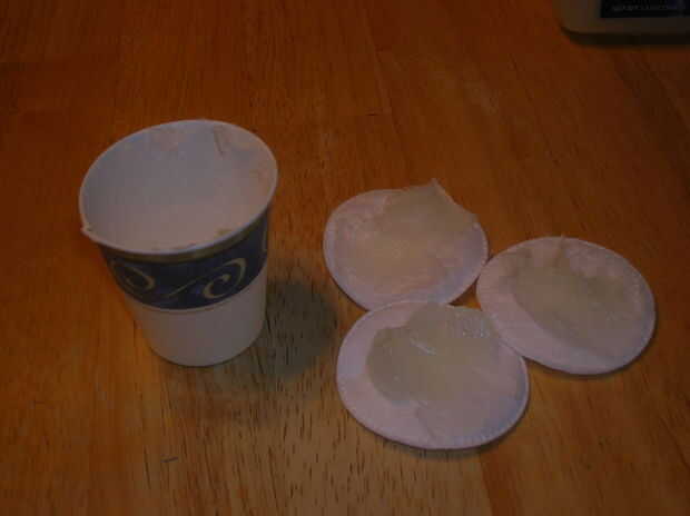 Ahora, tomar una taza, el cuchillo, la vaselina y las rondas de algodón barriles. Ponga algunos de vaselina en el interior fondo de la taza, que acumula el algodón barriles redondos en la parte superior, con el lado que tiene la vaselina sobre ella hacia arriba. Deshacerse del cuchillo.
