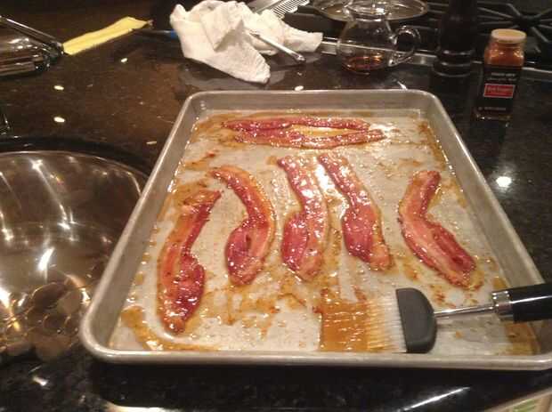 Después de que el tocino se ha cocinado por unos 5 minutos sacar y difundir jarabe de arce con brocha de cocina. Luego coloque en pimienta y cayena (más que poner en la más fuerte y más picante lo conseguirá).