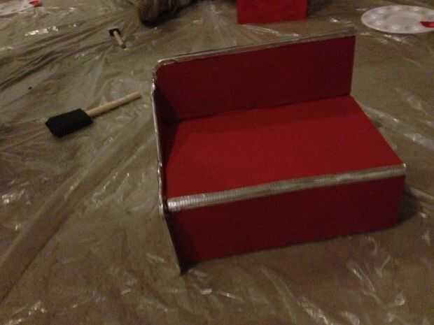 Comience apretando la pintura roja encima de la bandeja de pintura de la crafter. Sumerja el cepillo de la esponja en la pintura en la bandeja. Mientras sujeta el Banco de cabina totalmente estructurado por la pieza de soporte inferior, pintar el exterior entero del Banco rojo.