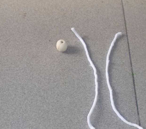 Paso 1: Utilizar un grano de madera, 2cm de diámetro. Tomar la cuerda de tela blanca.