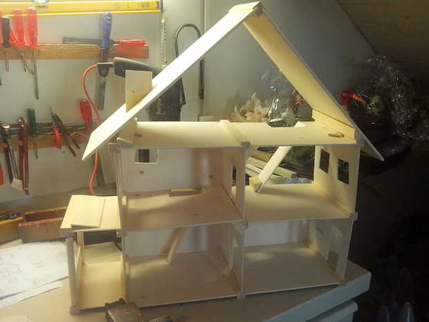 Descargar los dibujos o modelos de las piezas estándar. El tamaño de tu casa de muñecas como quieras y configurar un BOM (bill del material) con las dimensiones de cada parte.  Luego corte todas las piezas, puertas y ventanas y moler las esquinas y bordes. Realizar una verificación de ajuste con todas las partes antes de pintar. Si las ranuras están demasiado apretadas, hacerlos más grandes. Tenga en cuenta que la pintura se sumará al espesor de la madera contrachapada panel! He escrito los números de cada parte física para identificación e igualmente en el plano 2D. Esto le ayudará otra vez durante el montaje.