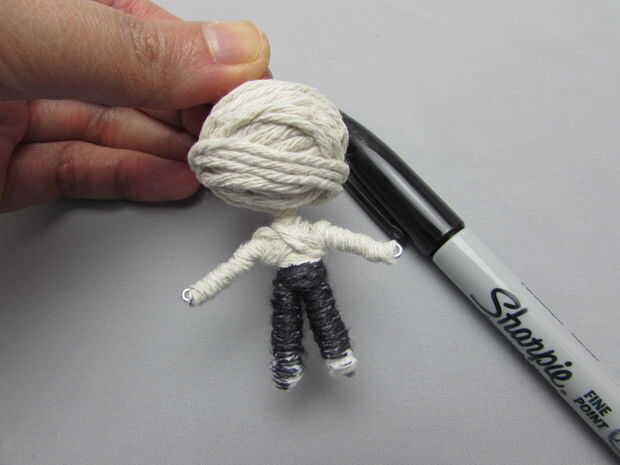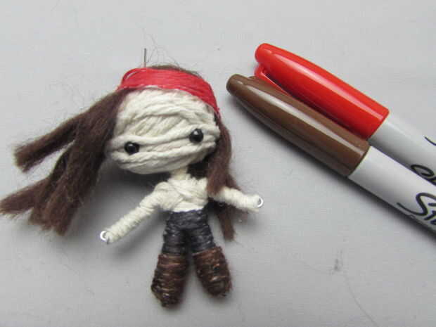 Me comenzó a envolver las piernas de los pantalones luego atar enhebrar la cuerda a través de la muñeca con una aguja y agregando algun pegamento. Yo los pantalones de color con un marcador negro. Las botas se hace la misma manera, pero coloreado con brown.