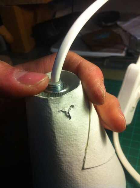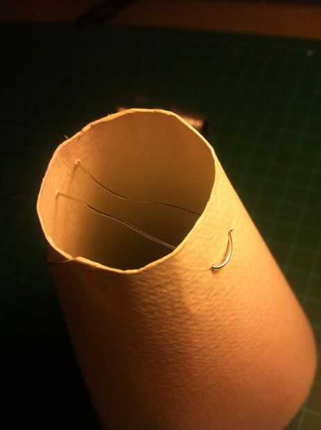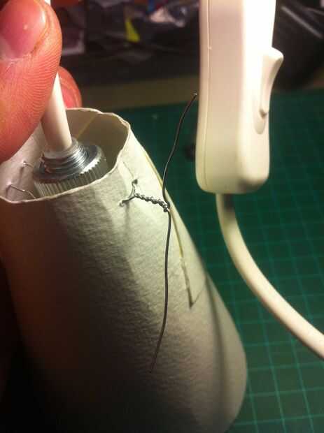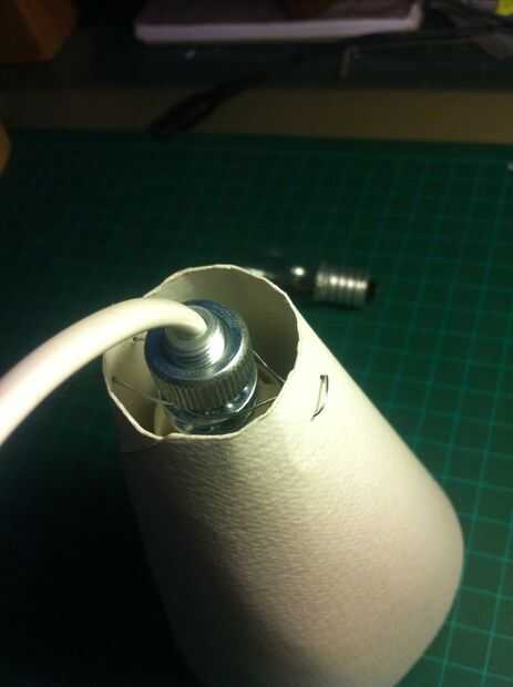 Cruce los cables entre sí, para hacer un círculo pequeño para la conexión de la lámpara sostener (cuadro 3). Algunas tomas de la lámpara pueden necesitar extras bucles de alambre alrededor de ellos para permanecer firmemente en el lugar, así tenlo en cuenta. Colocar el portalámparas en su lugar y cierre herméticamente. Trate de ubicar en el centro de tu pantalla. (imagen 4)