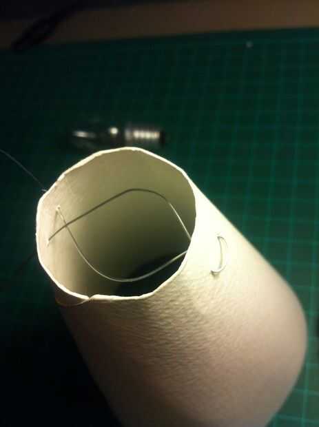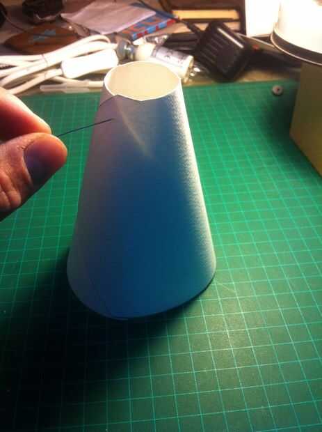 En primer lugar, tomar un alfiler y 2 agujeros de unos 0,5 cm unos de otros en el lado fino del cono (Fig. 1). Asegúrese de que los agujeros son un buen ajuste para el alambre de metal que vas a utilizar. Ahora usando un rolloer o simplemente a mano, perforar 2 agujeros más en el exacto enfrente de lado (todavía en la parte fina).