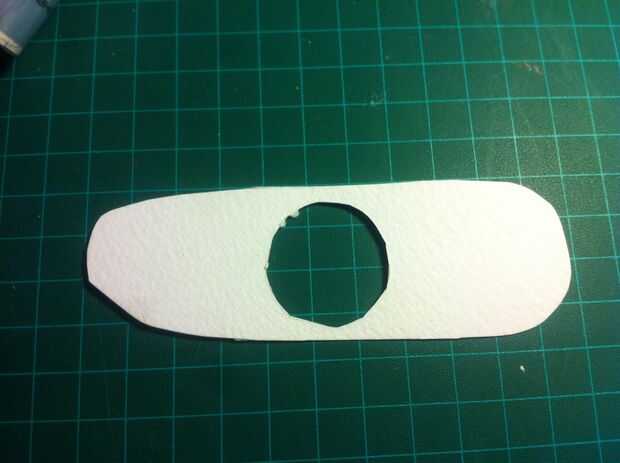 Encontrar el centro de la pieza de sobra y marque un círculo donde la hoja de la tarjeta debe agarrar la toma. Antes la toma de sí mismo pero también se puede medir Si el tuyo ya está conectado a la pantalla. (cuadro 2). Corte el círculo hacia fuera usando un cuchillo afilado. (Cuadro 3).