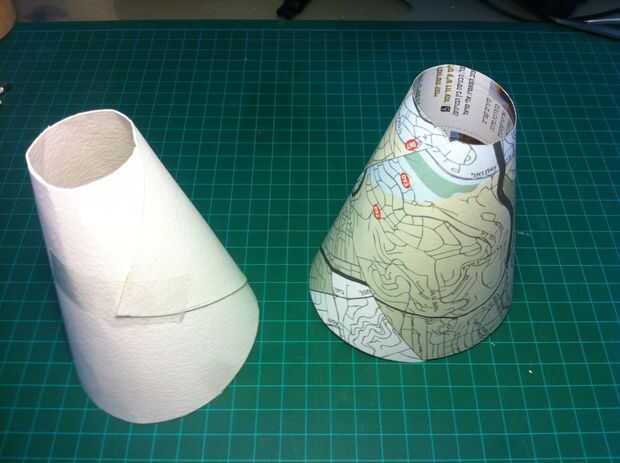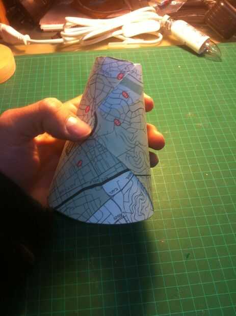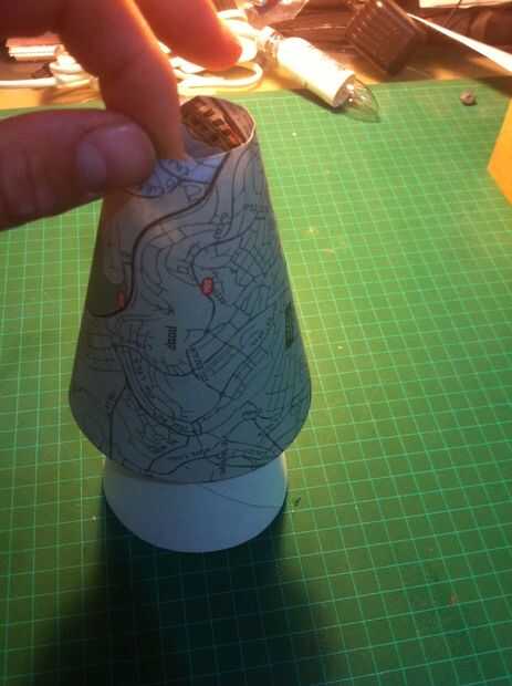 Personalmente me gusta mi pantalla blanca. Se adapta a mi habitación mejor. Pero si ya está haciendo su propio, usted puede decorarla! O pintura antes de que ruede para arriba, o como yo hice aquí, corte la segunda pieza exactamente la misma forma y póngala sobre como en la imagen. Usé un viejo mapa me gusta, pero también puede imprimir anyhing y utilizarlo.