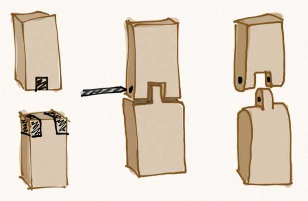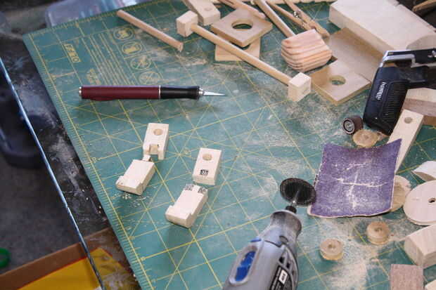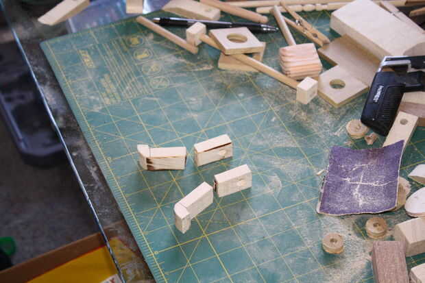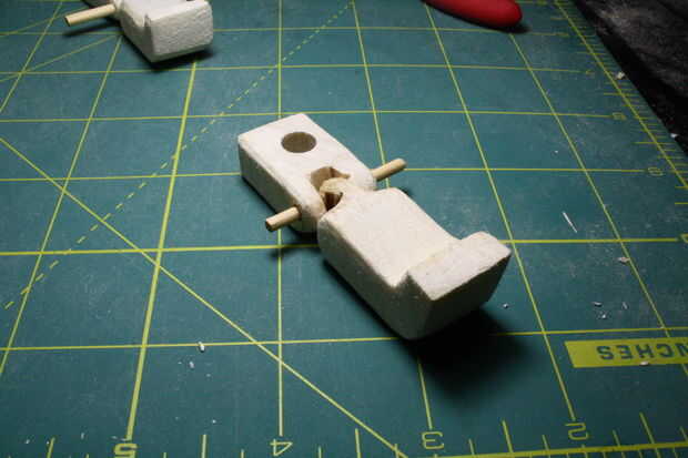 Quería que mi bot para tener las rodillas que doblaron, así que decidí hacerlos funcionar un poco como una bisagra a tope. Corté unos trozos más de madera en dos para que serían seguros para que coincida con las rodillas. Un disco de corte de la Dremel funciona bien para esto, o puede utilizar una sierra si prefiere tomar un largo tiempo. Alinearon las dos secciones y bosquejó los nudillos (los bits que se enclavija con el perno del eje) a cortar. Es un empalme simple, así que me quedé con tres nudillos. Cortar las piezas pequeñas es meticuloso trabajo y tener una parte de ella inmovilizada (como con un tornillo de banco o abrazadera) hará la vida mucho más fácil. Utilicé un disco de corte para cortes básicos y este poco de talla para despejar hacia fuera las porciones empotradas. Usted querrá usar un poco de lija para redondear los bordes de los nudillos, por lo que puede girar limpiamente, pero en primer lugar, asegúrese de que hacer un agujero para el eje. Es un dolor enorme para tratar de hacerlo después. Pop un pasador/pincho/perno delgado todas tres nudillos y asegúrese de que la articulación mueve como usted quiere que. Puede que necesite hacer ajustes adicionales con la Dremel.