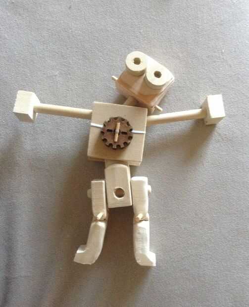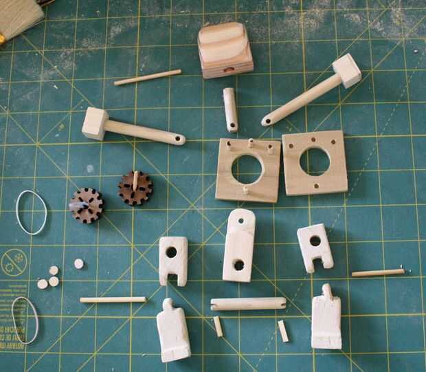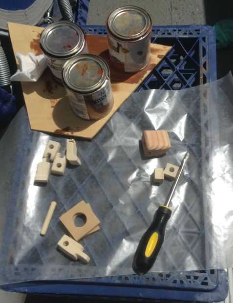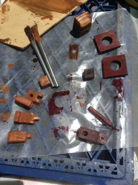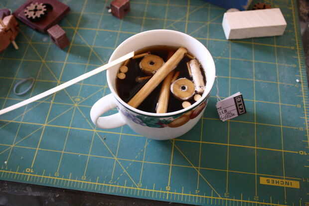 Quería que mi bot para tener un poco más variedad en su coloración, así que después de trapo (después de!) Puse todas las piezas juntas y era feliz con todo (después. No hacer esto antes de saber que haya terminado con la talla. Compruebe el siguiente paso para más ayuda montaje ahora si usted necesita), tiró de él todo aparte, lijar todas las piezas con papel de lija fino e hizo algunas manchas con diferentes colores. En realidad, los colores parecía un poco demasiado agradables, por lo que yo les enarenó muy ligeramente una vez que había secado para darles un poco más carácter. La mayoría de ellos fueron manchada con tinta para madera oficial, pero para los tacos y clavijas que quería ser un poco "sucia," que he logrado por sumergiéndolas durante unos minutos en una taza de té y dejarlos secar. (Hay muchos tutoriales sobre cómo hacer las manchas de bonitas con té, pero yo sólo quería un cambio muy sutil para estas piezas, que todo en remojo le dará).