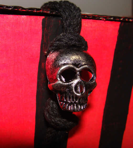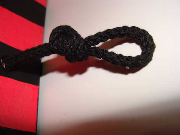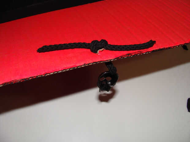 A continuación hice un agujero en el ataúd por debajo de la que acabo de hacer. En este caso puse un pedazo largo de empate línea a través y luego había atado un lazo pequeño. El lazo irá encima de la cabeza del cráneo. He atado un nudo en el interior y con cinta en los extremos.