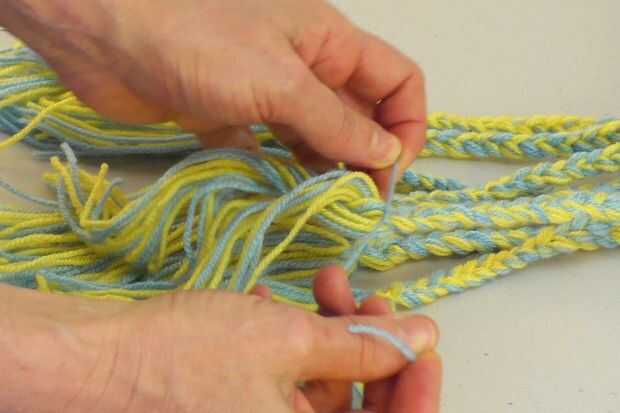 Utilizar un peso para fijar el cabello (aquí mediante una pila de libros). Un tentáculo a la vez, eliminar el giro lazo, trenza, luego amarrar con una longitud de 4" del hilado. Doble nudo y corte el exceso.