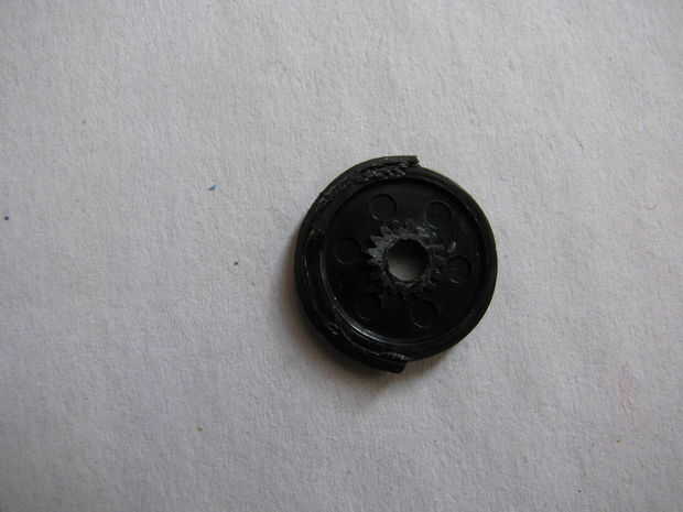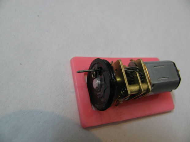 La muñeca debe girar un poco, deje de girar, saca su lengua y continuar torneado. Así que cortar alguna banda de goma a la longitud de la mitad del perímetro de la rueda y adjuntarlo a la rueda con el pegamento. Colocar una aguja a la rueda en el lado opuesto de la banda de goma. Luego coloque la rueda al motor.