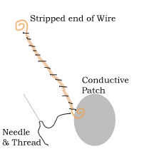 Alambre fino, como un solo filamento de alambre de teléfono puede utilizarse en lugar de hilo conductor. Y rizar los extremos, se puede coser el alambre en un pedazo de tejido, teniendo al final rizado hacer contacto directo con el parche, LED plomo o final del soporte de batería.