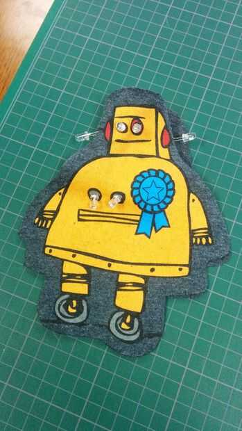 Tiempo para decidir dónde poner el LED! Elegí la colocación algo obvia que uno eligió para el robot de Instructables, que consiste en ojos, pecho diodos y los conductores del lado de cabeza. No es necesario pegar los cables del LED a través de la tela, lo hice porque paraban de moverse de donde quería estar.