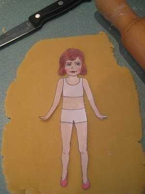 Coloque la plantilla de muñeca de papel sobre la masa y usando un cuchillo afilado cortar alrededor de la plantilla con cuidado.
