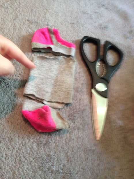 Corte el talón y la puntera del calcetín como se muestra en la imagen. Luego corte los orificios en la parte que estoy señalando en la imagen. Se trata de la camisa o vestido, dependiendo del tamaño de tu calcetín.
