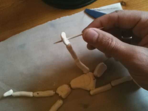 Una vez que la cadena está dentro de la marioneta tomar el palillo de dientes y hacer un agujero a través de las manos y los "muslos" de tu títere