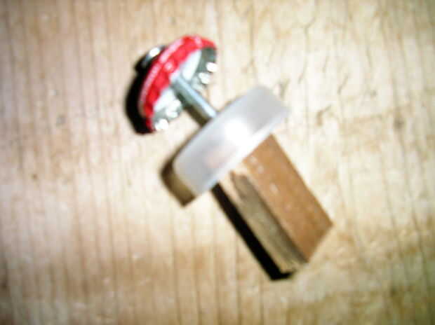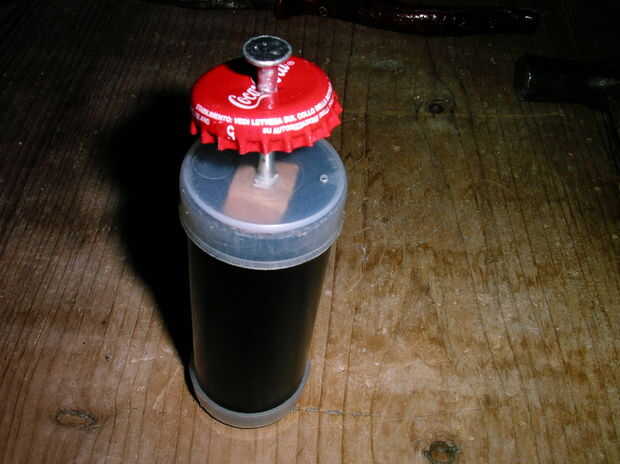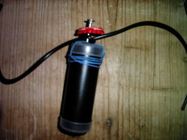 Clavo el clavo grande en la tapa de la corona, luego al conector del tubo plástico y finalmente a algo lo suficientemente robusto para dejar la uña en su lugar (yo usé un trozo de madera). Ahora puede cerrar el tubo otra vez. Atar algunas bandas de goma en la parte superior del tanque y finalmente Conecte el cable eléctrico a la uña debajo de la tapa de la corona con un nudo.