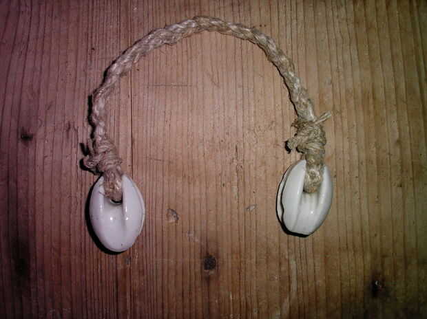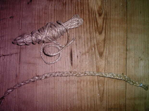 Si la cuerda es demasiado fina para los brazos, luego trenzar. Atar los extremos de la cuerda trenzada, para no desmontar. Ahora atar los extremos de la cuerda a las manos: en este caso los pedacitos de cerámica. Puede utilizar la más fina cuerda para atar la cuerda más grande en las manos.