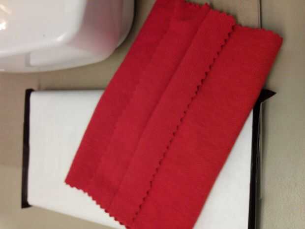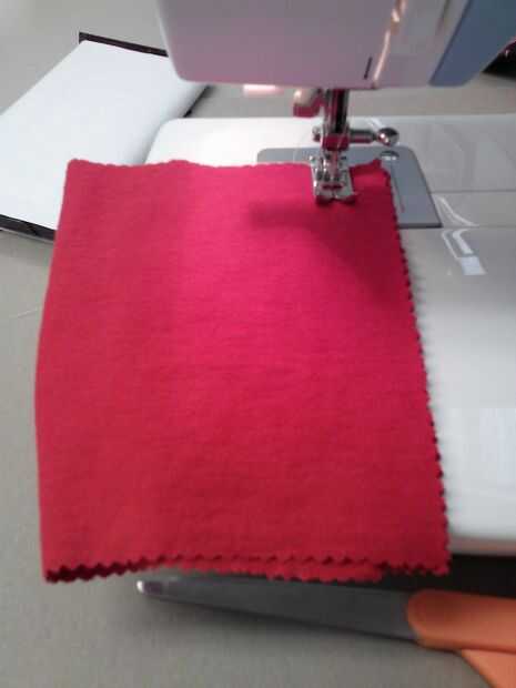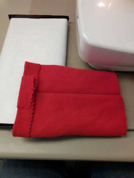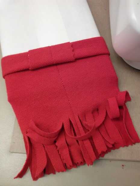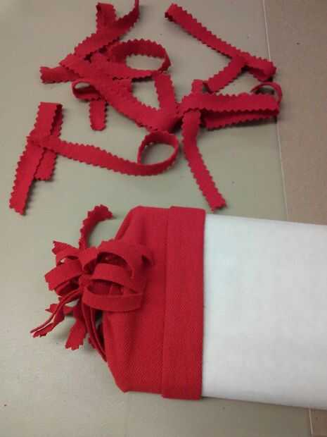 Cortar un rectángulo de la tela de punto rojo para el sombrero. 7 "x 10" este doble por la mitad por lo que ahora es 7 "x 5" y coser el lado, con un margen de costura de 1". Abra la costura y girar a la derecha-lado-hacia fuera. Doblar un extremo para arriba aproximadamente 1" y luego doblar de nuevo. En el otro extremo, corte tiras de 2" de largo, aproximadamente 1/2" de ancho. Corte 6" pedazo de tela roja para atar lo pom pom en la parte superior del sombrero. Crujir la franja juntos y atar la tira de tela roja alrededor de él con un nudo. Cosí un botón en la parte delantera del sombrero. Esto es opcional pero ayuda a mantener el ala del sombrero de despliegue. También cosí unas puntadas en la parte de atrás donde está la costura.