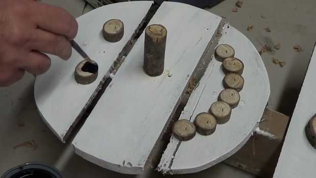 Ahora es el momento para pintar las piezas de la rama de madera que cortamos por la nariz, ojos, boca y botones