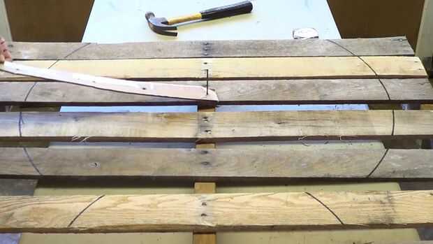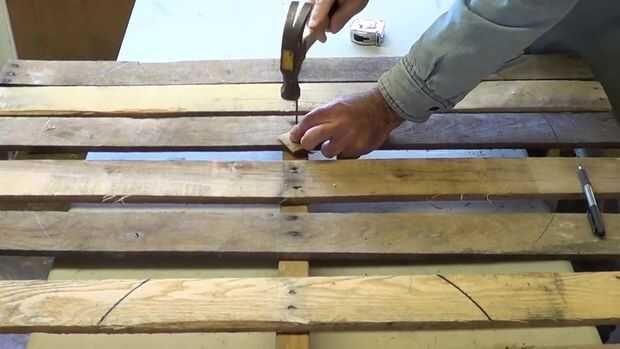 Ahora coloque el calibrador de cartón con el clavo en la marca de 1" a 36 3/4" ubicación. Ligeramente del martillo el clavo en la plataforma como se muestra en las fotos. (No clave a profundo, como tenemos que sacar el clavo de nuevo)