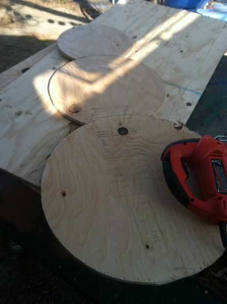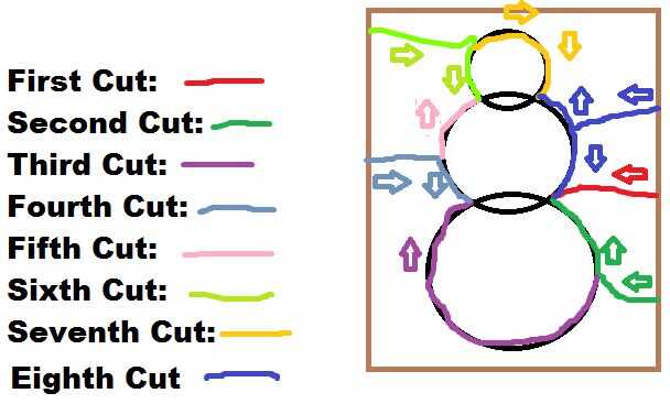 Al cortar los círculos, destacar lo que los hace perfecto, por supuesto que desea circular. Pero, es un muñeco de nieve! Recuerde mantenga la sierra firmemente, y seguir el dibujo tan cerca como sea posible. trate de no dejar demasiadas veces te toparás con una mayor posibilidad de hacer cortes irregulares. Parada donde los dos círculos de intercepción. Así, ahora, se preguntaba cómo convertir la sierra para iniciar el próximo círculo. Vea por favor el cuadro proporcionado. Cortar desde el borde de la madera, a 3 pulgadas arriba de la interceptación, luego una vez que llegue cerca del círculo alinear mi hoja para arriba con el círculo y continuar siguiendo la línea hasta que el encuentro anterior corte, el principio y continúe alrededor. Piezas innecesarias comenzará a caer, lo que es más fácil de cortar. seguir adelante hasta que tenga un muñeco de nieve! Usted puede hacer la parte inferior plana. Sin embargo, opté por mantener la ronda.