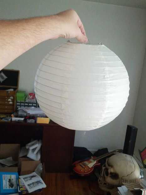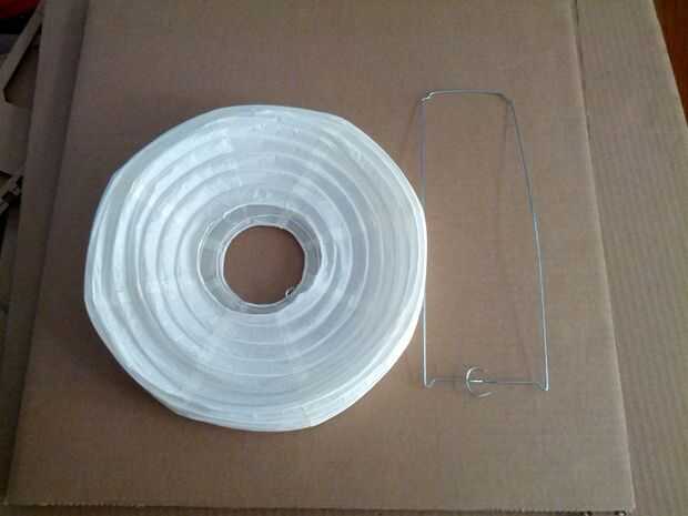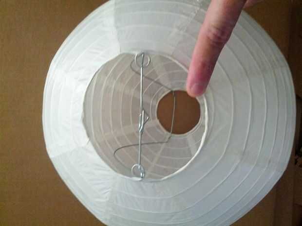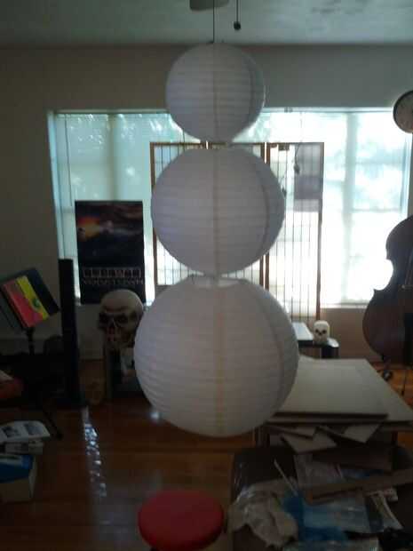 Use 3 farolillos de diferentes tamaños.  Ponerlos juntos para convertirlos en grandes bolas de nieve falsas.  Conecte uno encima del otro con los más grandes en la parte inferior y colgarlos en algún lugar.