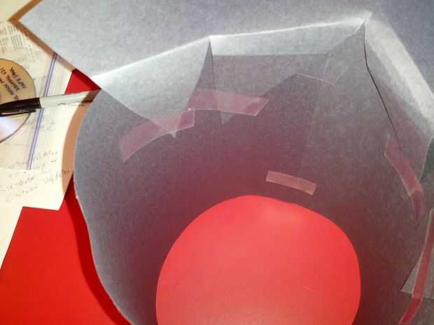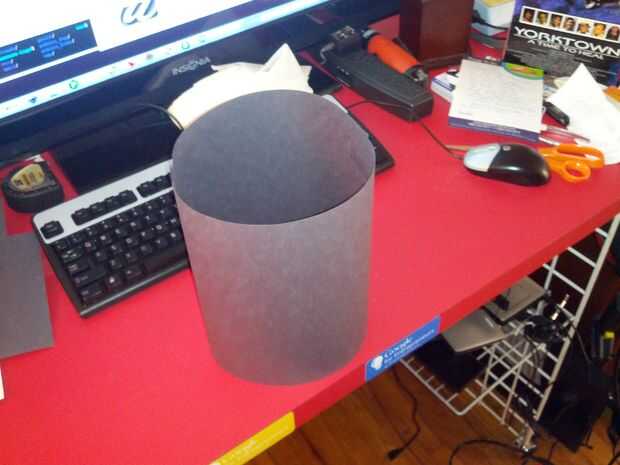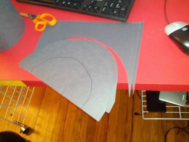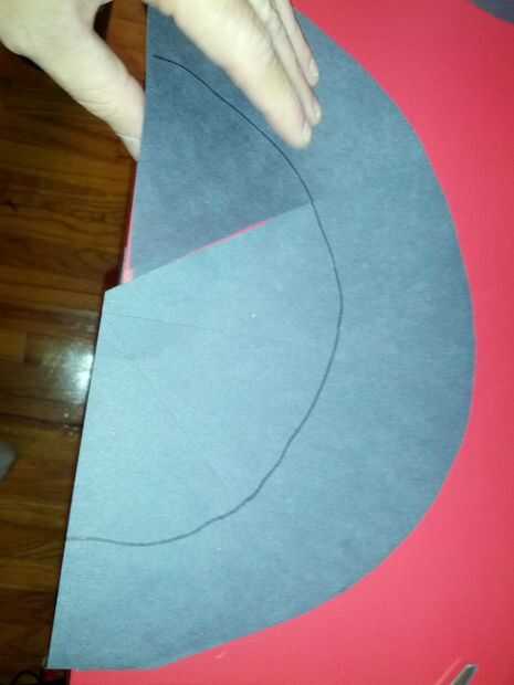 Con otra hoja de papel negro de construcción, estimación de donde quieres cortar por el borde y cortar dos hojas uno encima del otro para hacer 2 semicírculos (una de las hojas puede ser la hoja que corte un poco más temprano para hacer los ojos). Cortar radialmente unas cuantas veces en semicírculos dejando suficiente espacio para el borde. Cinta adhesiva los extremos angulares en el centro del tophat, para que el borde sobresale. Hacer ambos lados del tophat.