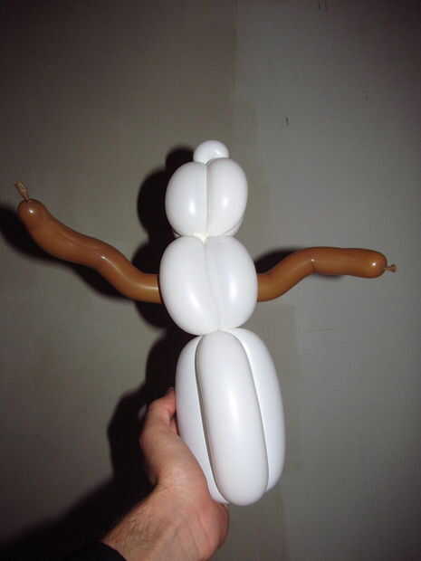 Hacer una pequeña pizca de la torcedura con el globo restante uno procedente de la parte superior de la cabeza del muñeco de nieve. En este punto estamos todos listos con los globos blancos. Pop y corbata de cualquier globo extra te puede queda.