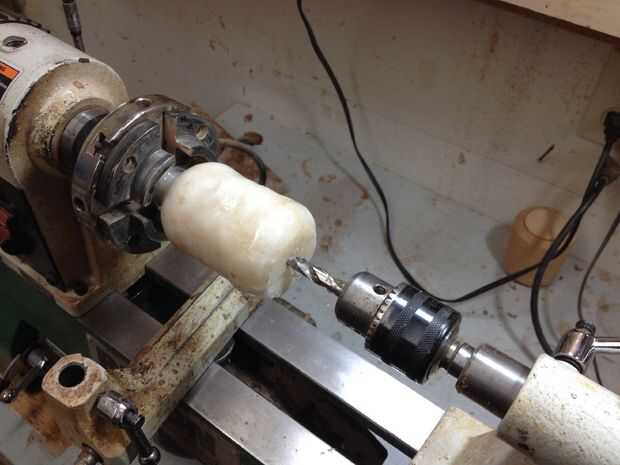 Luego fue apagado para el torno. Me perforó un agujero de 3/8 y había montado sobre mi vástago de tapón de botella! Puso el contrapunto y maltratados de una forma. El epoxi se vuelve bueno, y es bastante fácil de trabajar.