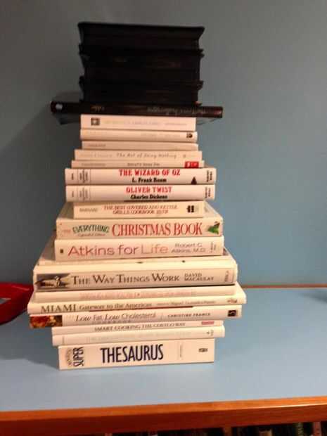 Los libros fueron apilados sobre una superficie con una pared detrás. Los libros pueden deslizarse y sería una lástima tenerlos deslizarse fuera de la superficie plana totalmente! Simplemente empecé con libros de blanco tamaño medianos y apilados hacia arriba haciendo la pila más amplia mientras coloca los libros uniformemente desde el centro de cada libro. Después he creado la parte más ancha de mi muñeco de nieve, empecé a reducirlo nuevo a hacerle bola formada. Una vez que su cuerpo terminó, he añadido una cabeza usando mis libros más pequeños móviles para libros de tamaño pequeño y a menor tamaño libros. Luego agrega un largo libro negro como el ala del sombrero y apiladas 3 audio libros sobre la cara superior hacia atrás por lo que mostró el borde negro.