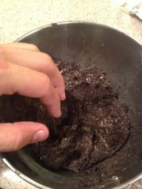 .Paso 1: ingredientes -30 galletas Oreo (1 paquete)-Capa caramelo (vanillia)-8 onzas de queso crema-Negro y naranja glaseado decorativoPaso 2: Paso 1 Lugar de Oreos en un recipientePaso 3: Paso 2 Romper la galletas Oreo en trozos más pequeñosPaso 4: