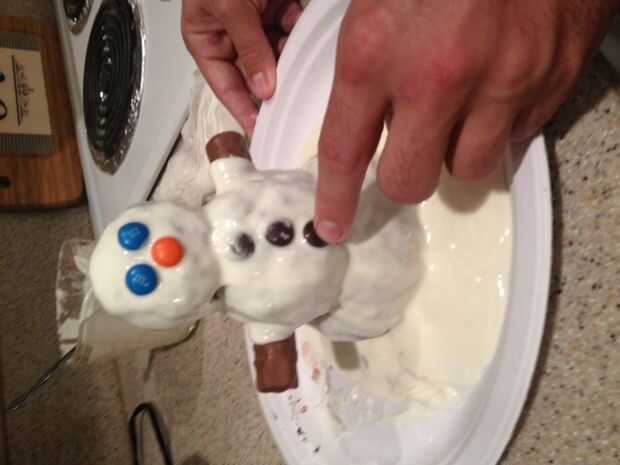 Ahora el lugar twix en la bola de oreo de tamaño medio como los brazos.  Derretir el chocolate blanco y verter sobre las bolas de oreo. Mientras que el chocolate está caliente lugar m & ms para botones, nariz y ojos.