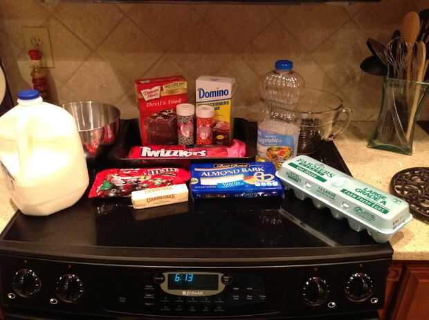 Las ingreients necesarias para este aperitivo son mezcla de torta de chocoolate, 3 huevos, 1/3 de taza de aceite vegetal, 1 taza de agua, 1 caja de azúcar, 1 barra de margarina, 4 cucharadas de cacao, 1/4 taza de leche, twizzlers, M & M, sprinkles, papel de cera y corteza de almendra chocolate blanco. Usted también necesitará tres tazones de fuente, un molde para pasteles, medición de tazas, una licuadora, un horno y un microondas.