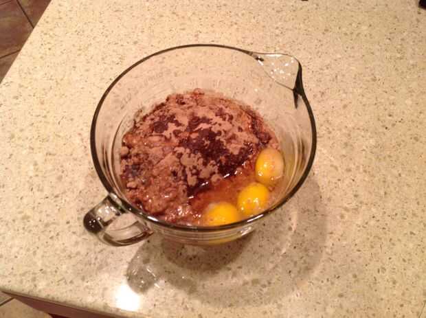 En uno de los tazones de fuente, agregar la mezcla de pastel de chocolate, huevos, aceite vegetal y agua.