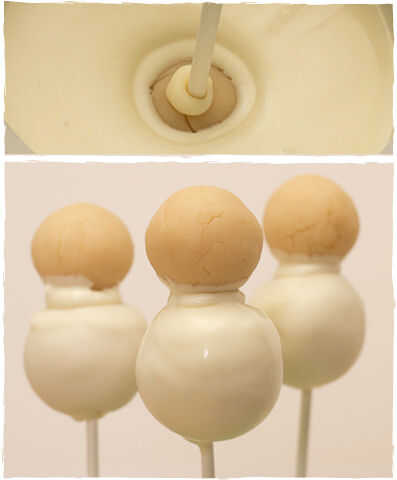 Sumerja un pop cake hacia abajo en el blanco de la capa hasta que la bola de la torta es totalmente cubierta y sellada. Si usted necesita a ángulo de lo pop cake, incline suavemente en una dirección y luego otro. No remover la capa con el pop cake o puede caer en el palo. Eliminar lo pop cake de la capa fundida tirando hacia arriba. Luego, gire la torta pop en un ángulo y golpee suavemente apagado cualquier exceso capa. Colocar lo pop cake en posición vertical y situado en un soporte pop bloque o torta de espuma de poliestireno. Seguir trabajando rápidamente para que no endurezca la capa antes de añade la bola de menor tamaño de la torta en la parte superior. De mano, echar una bola de menor tamaño de la torta la capa de caramelo para que sólo un borde está cubierto. Luego ponerlo en la parte superior del pop cake revestido, usar la capa de caramelo como sello para unir las dos piezas. Pare su muñeco de nieve, completar este paso para todos sus pops de tarta restante y colóquelos en el refrigerador para enfriar.