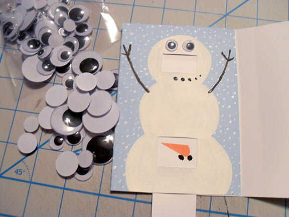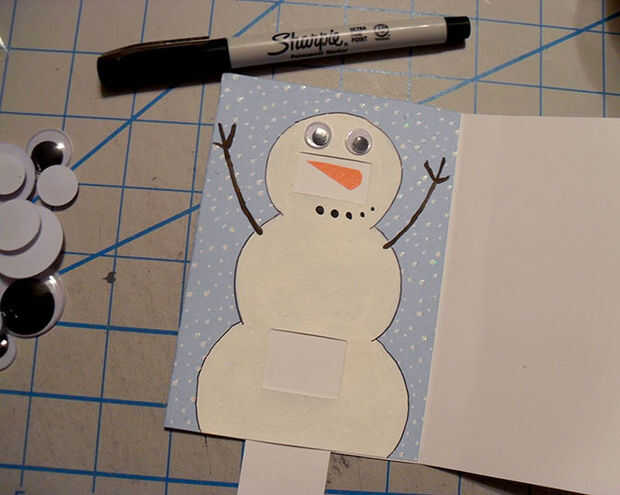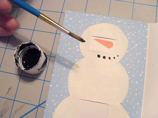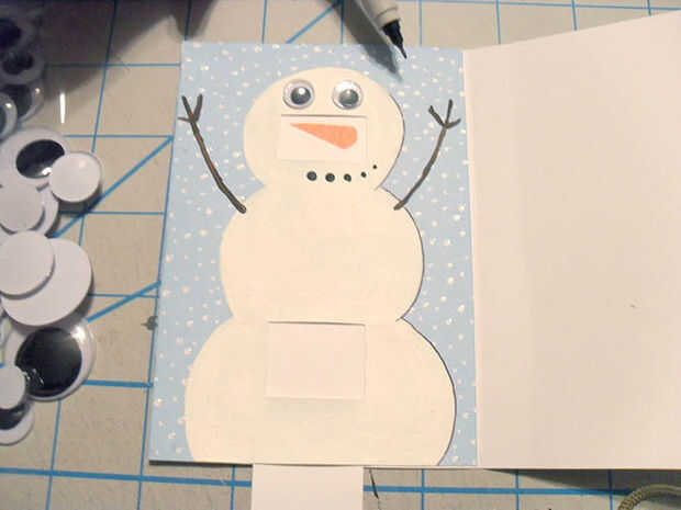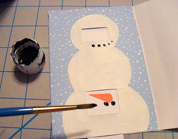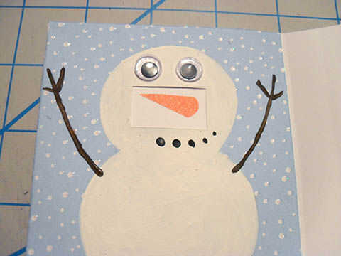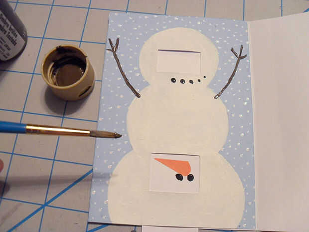 Utilizar acrílico marrón del arte para hacer brazos palillo divertida. Dependiendo del ancho de la tarjeta, no puede tener un montón de espacio. Dio mi muñeco de nieve algunos exuberante brazos en el aire, porque creo que es lo que puede hacer un muñeco de nieve de nudista.