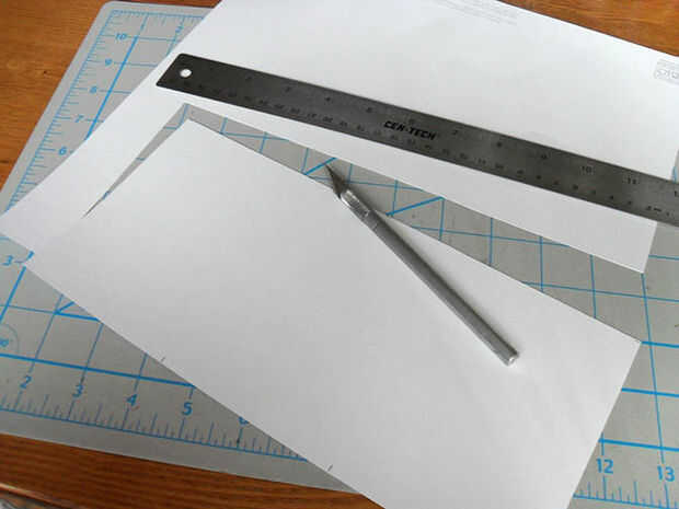Cortar la forma del rectángulo largo. Una regla y x-acto le dará resultados precisos.