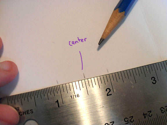 Utilizando una regla a lo largo del borde inferior, encontrar el punto medio de la anchura de la tarjeta de. Ya sabemos mi tarjeta al ser de 3,5 pulgadas de ancho, significa que mi punto medio es de 1,75 pulgadas. Hacer una muesca de lápiz aquí.