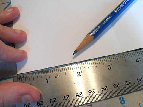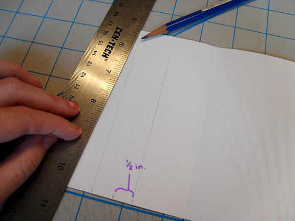 Usa tu regla y lápiz para dibujar dos líneas vas hacia arriba desde tus lado marcas. Esto es el ancho de la pista para su deslizamiento Part de tarjeta.