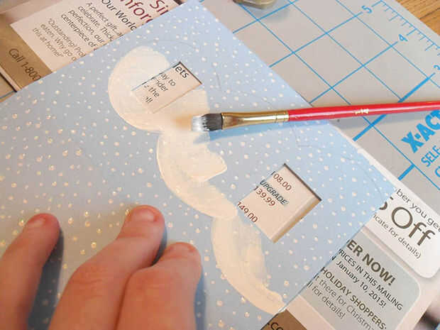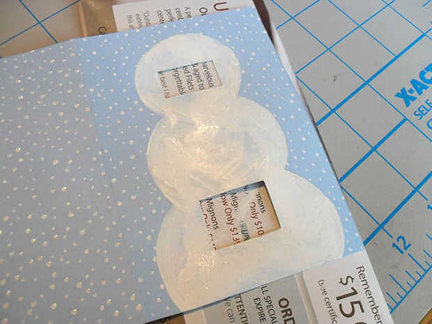 Acrílico blanco artesanía de uso para rellenar el muñeco de nieve en la parte delantera de su tarjeta Tienes que poner un trozo de papel de desecho debajo para que la pintura que va encima del borde de los puertos de no destruir nada. Usé un folleto de Omaha Steaks, porque te probablemente me envían 4 nuevos esta semana de todas formas.