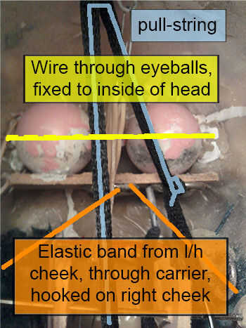 Otra grapa se ajustaron a la parte superior del interior de la cabeza y una cadena de funcionamiento de la compañía, hasta a través de este básico y a través de la cabeza y el cuerpo, que cierra los ojos cuando se tiró. Puede que necesite experimentar con la tensión de la venda de elástico y el posicionamiento de este producto básico superior para obtener el ángulo derecho para que funcione sin problemas.