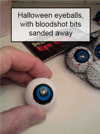 Trató de colorante en los ojos, pero no pudo lograr nada que fui feliz con, pero pasado Halloween he encontrado unos ojos inyectados en sangre falsas en la tienda de la libra. Cuidadosamente lijadas las venas inyectados en sangre, luego cortar los globos oculares para pegar en las bolas de desodorante.