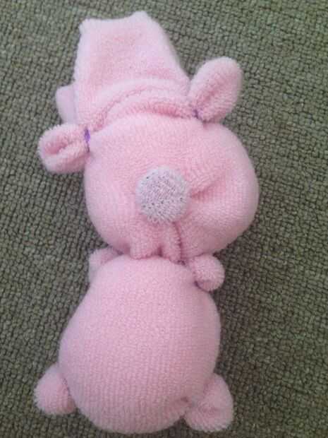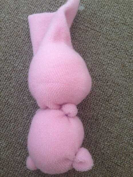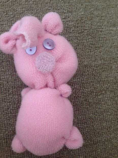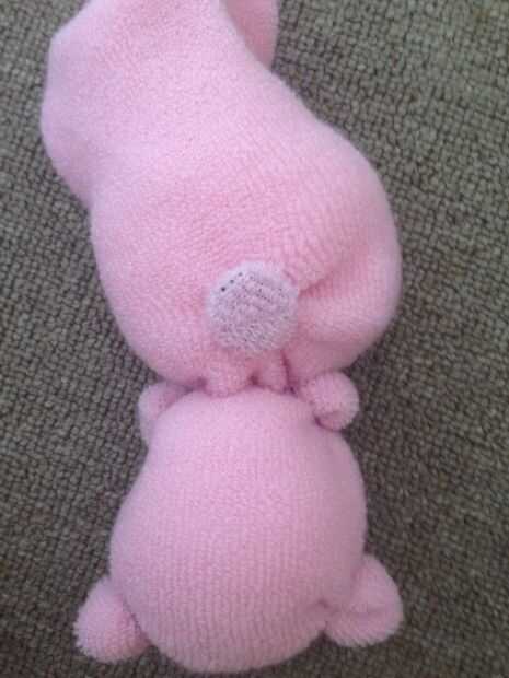 2) estoy haciendo un cerdo por lo que poner un boton en el calcetín y asegurarla con un elástico para darle una nariz