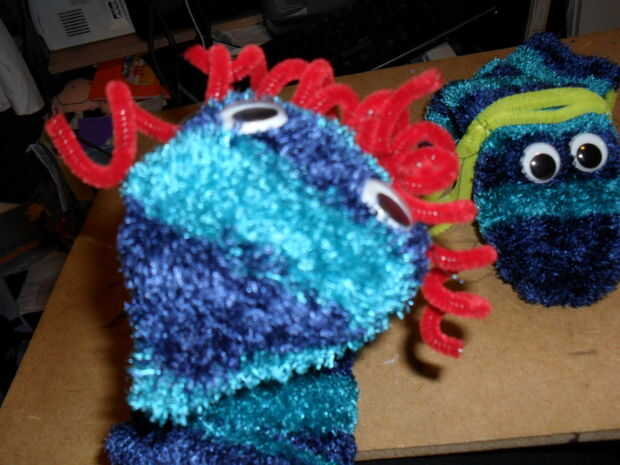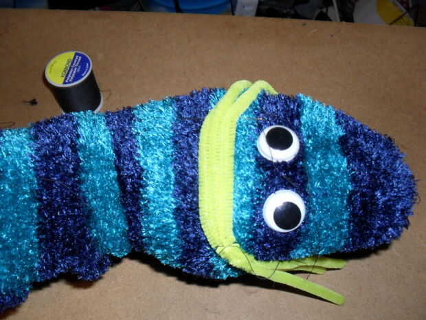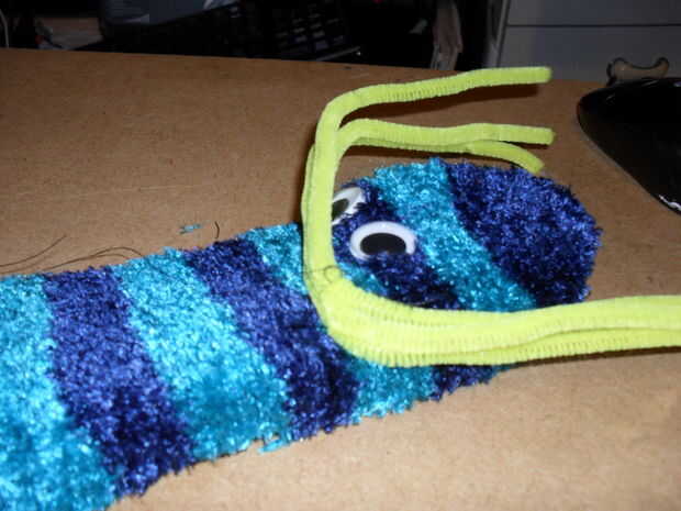 Lo que hice fue tomar un puñado de limpiapipas y coser en su lugar, pegamento funcionan igualmente bien. Sólo para hacer el pelo rizado, me torcí el limpiapipas alrededor de mi dedo.