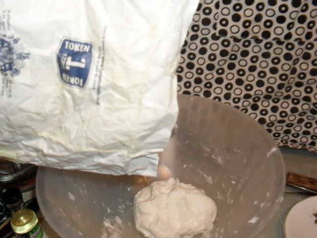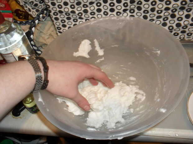 Ahora en el paso 1 que mencioné acerca de tener extra azúcar glas...  Bueno... aquí es donde entra en (tal vez)... Ahora no todos los huevos son un tamaño estándar y el peso... por lo que su mezcla (en adelante referido como Goop) puede ser un poco líquida y no puede unir como debe... Mi Goop fue abit de un lío que moquea, así que añadido pequeñas cantidades de azúcar glas hasta que se convirtió en una bola blanca firme. no se siente húmedo al tacto.