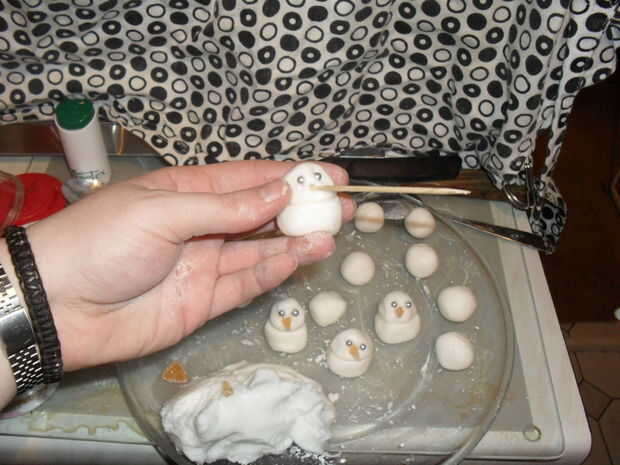 Si usted está haciendo su propia nariz, la izquierda sobre Goop y mezcla colorante un poco de naranja comida, rodillo en forma de zanahoria y pegarlo a la parte delantera de la cara de snowmans.