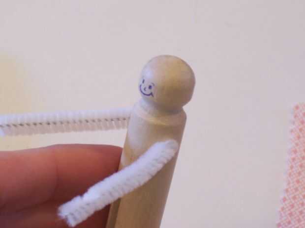 Para los brazos, centro de una pieza larga de aproximadamente 4 pulgadas de limpiadores en la muñeca y doblar los brazos hacia adelante. Doblar un poco en los extremos la punta afilada y hacer las manos. Doblar en el codo en la posición deseada.