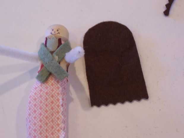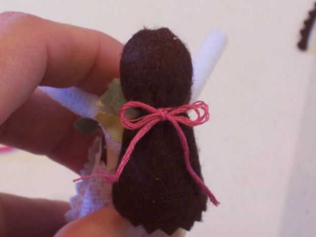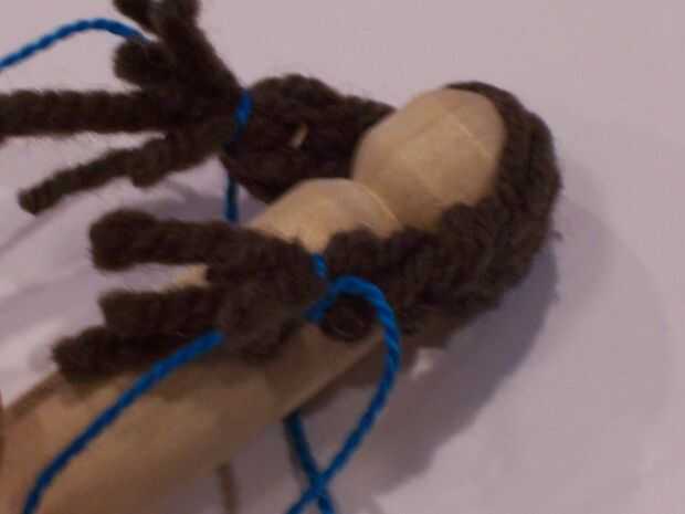 Una vez seco el pegamento, de fieltro, usar seda del bordado para atar el hilo en una cola de caballo o corte de hilo para un peinado bob.