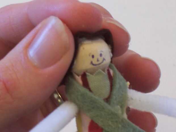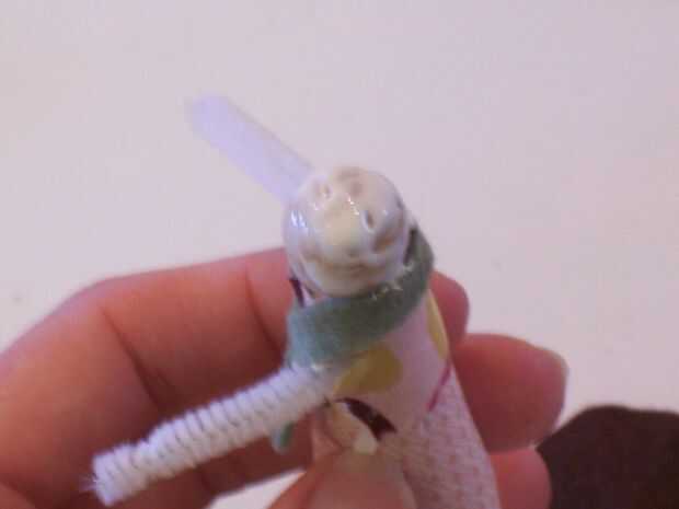 Untar la parte superior, hacia atrás y los lados de la "cabeza" de la muñeca con el pegamento.